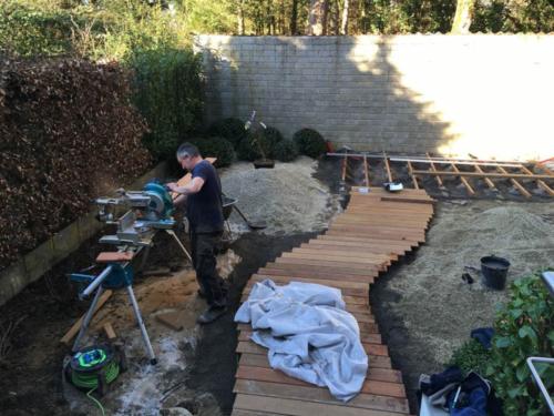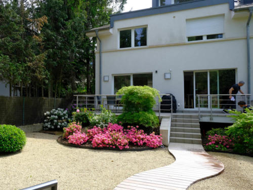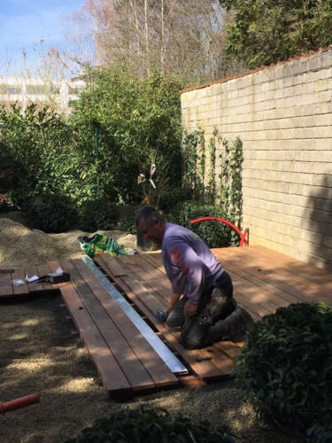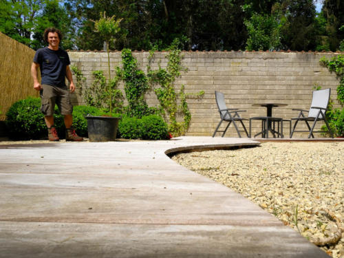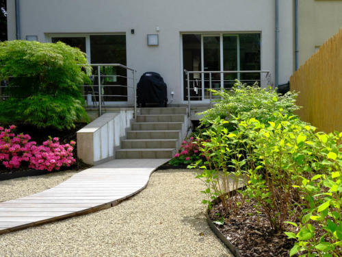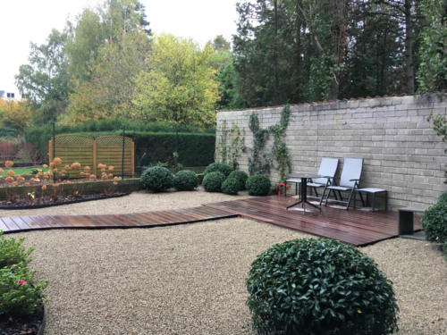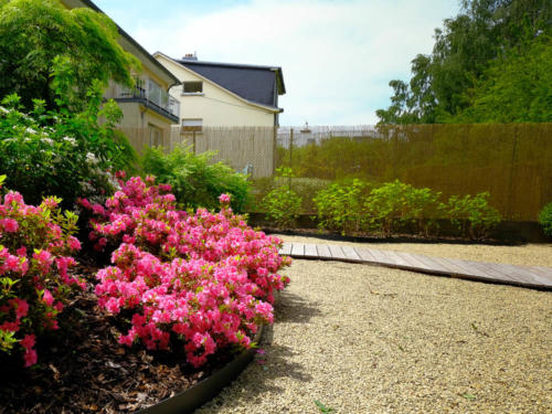 L’idée était de construire une terrasse en bois de style japonais, avec mise à niveau du terrain et intégration d’arbustes et de fleurs, en toute harmonie.